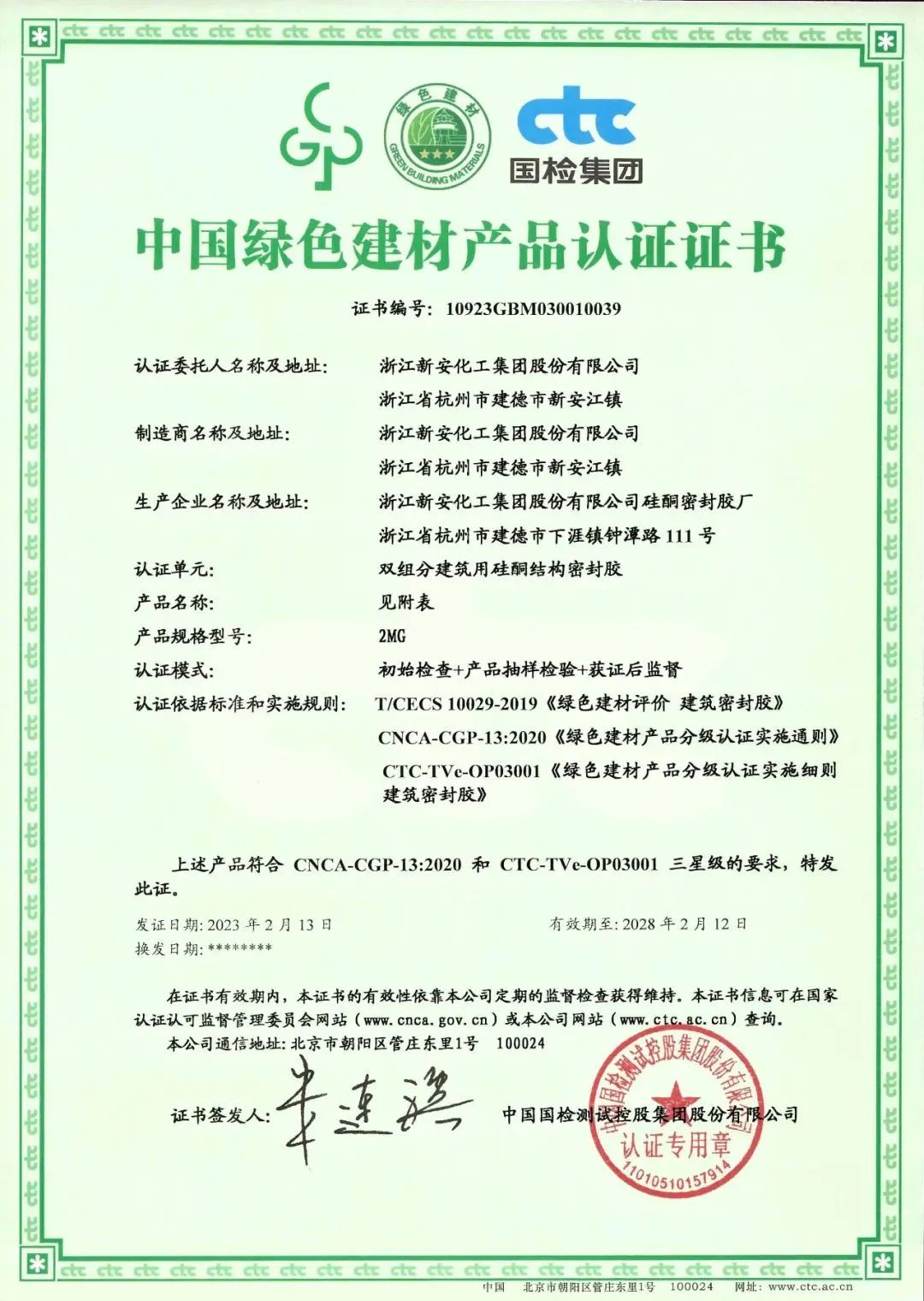 新安作為綠色化學的領(lǐng)創(chuàng)者,緊跟國家綠色低碳發(fā)展步伐,通過發(fā)揮硅基新材料產(chǎn)業(yè)鏈優(yōu)勢,積極探索綠色建筑密封解決方案,近期新安旗下8款建筑密封膠產(chǎn)品通過中國建材檢驗認證集團股份有限公司(CTC國檢集團)的檢測,榮獲《中國綠色建材產(chǎn)品認證證書》。